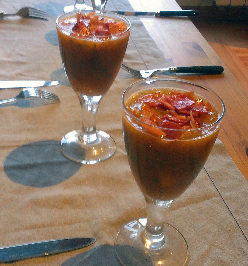 Soupe de melon – servi froid (melon, menthe, jambon Serrano)